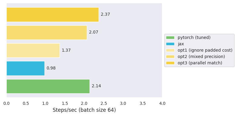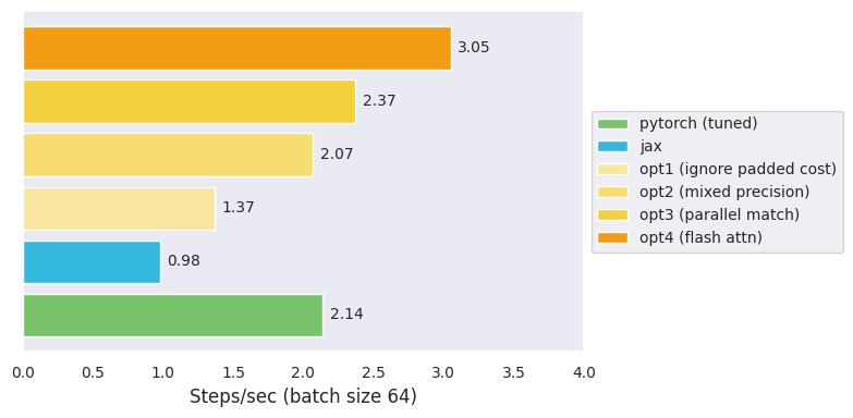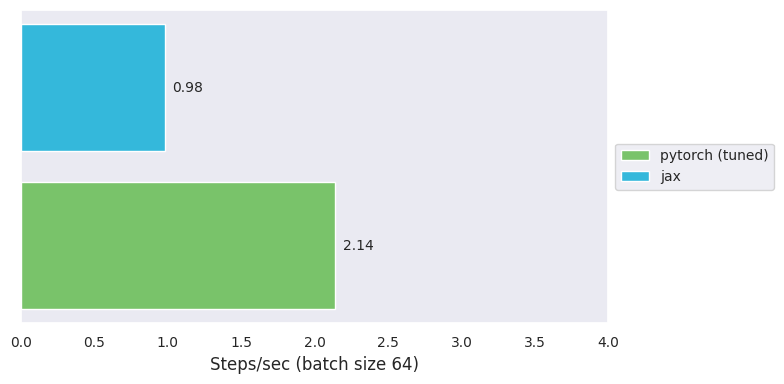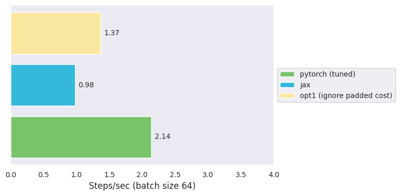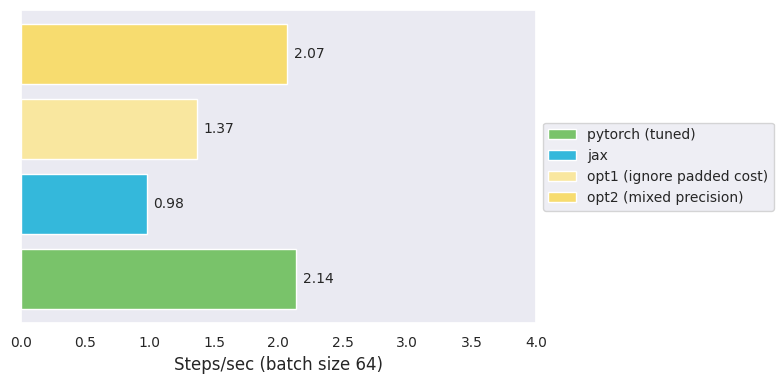 For now, let us be content with the potential speedup. We are now at $3.0$ steps/s, 33% faster than PyTorch, taking 2 days to train.