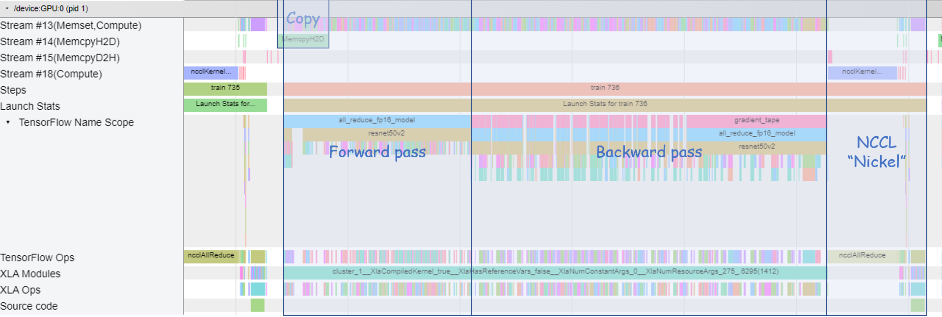 With a total forward + backward pass time \(T_s = 234\text{ms}\), we spend an additional \(T_c = 106\text{ms}\) in communication (“NCCL”), in line with our estimate above. Note that we already save time prefetching batches to the GPU by overlapping it with computation (“Copy” step). With this information, we can calculate the scaling efficiency \(\eta\) of our cluster.